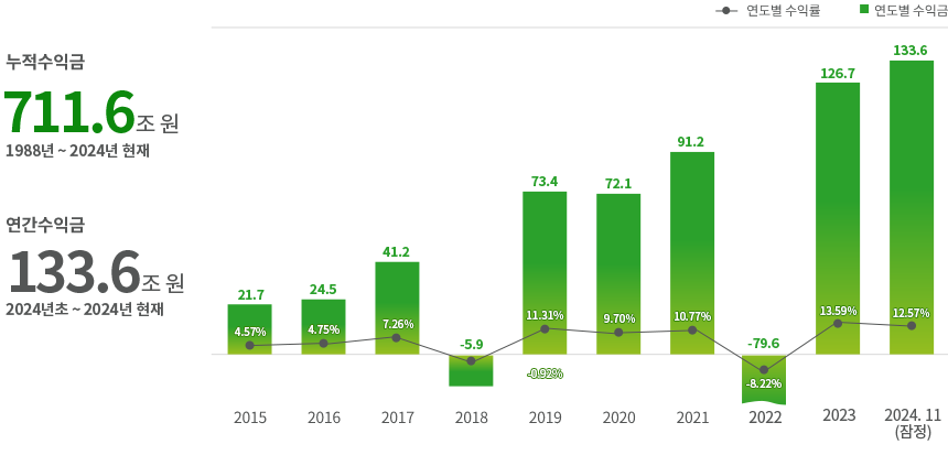 국민연금은 **장기적으로 연평균 5% 이상의 안정적인 수익률**을 유지하고 있습니다. 1988년부터 2023년까지의 연평균 수익률은 **5.92%**로, 글로벌 주요 연기금 대비 높은 성과를 기록 중입니다.